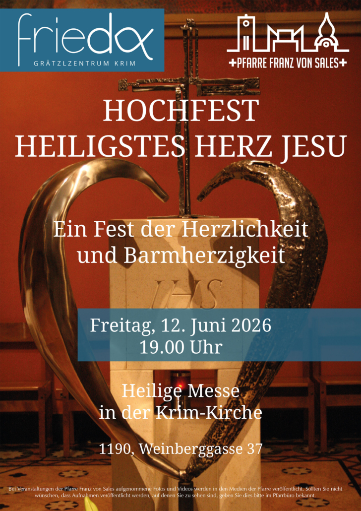 12.6. Hochfest Heiligstes Herz Jesu19. Februar 2026/in Frieda, Glanzing, Kaasgraben, Krim, Veranstaltungen Herzliche Einladung zur Heiligen Messe in der Krim-Kirche, Beginn 19.00 Uhr: Ein Fest der Herzlichkeit und Barmherzigkeit. https://franzvonsales.at/wp-content/uploads/2024/03/herzjesu2024_logo-scaled.jpg 851 2048 Herbert Winklehner https://franzvonsales.at/wp-content/uploads/2016/10/logoneu-300x187.png?_t=1478028586 Herbert Winklehner2026-02-19 10:00:002026-04-25 11:39:2712.6. Hochfest Heiligstes Herz Jesu