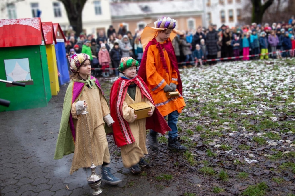 28 Kinder brachten eine großartige schaupielerische Leistung auf die „Park-Bühne“ im Krim-Park und führten damit am Heiligen Abend, Mittwoch, 24. Dezember 2025, mehrere 100 Zuseher:innen in die Weihnachtsgeschichte ein. Der feine Nachmittag wurde mit Punsch und Waffeln abgerundet und ging danach in die stimmungsvolle Kindermette über.
